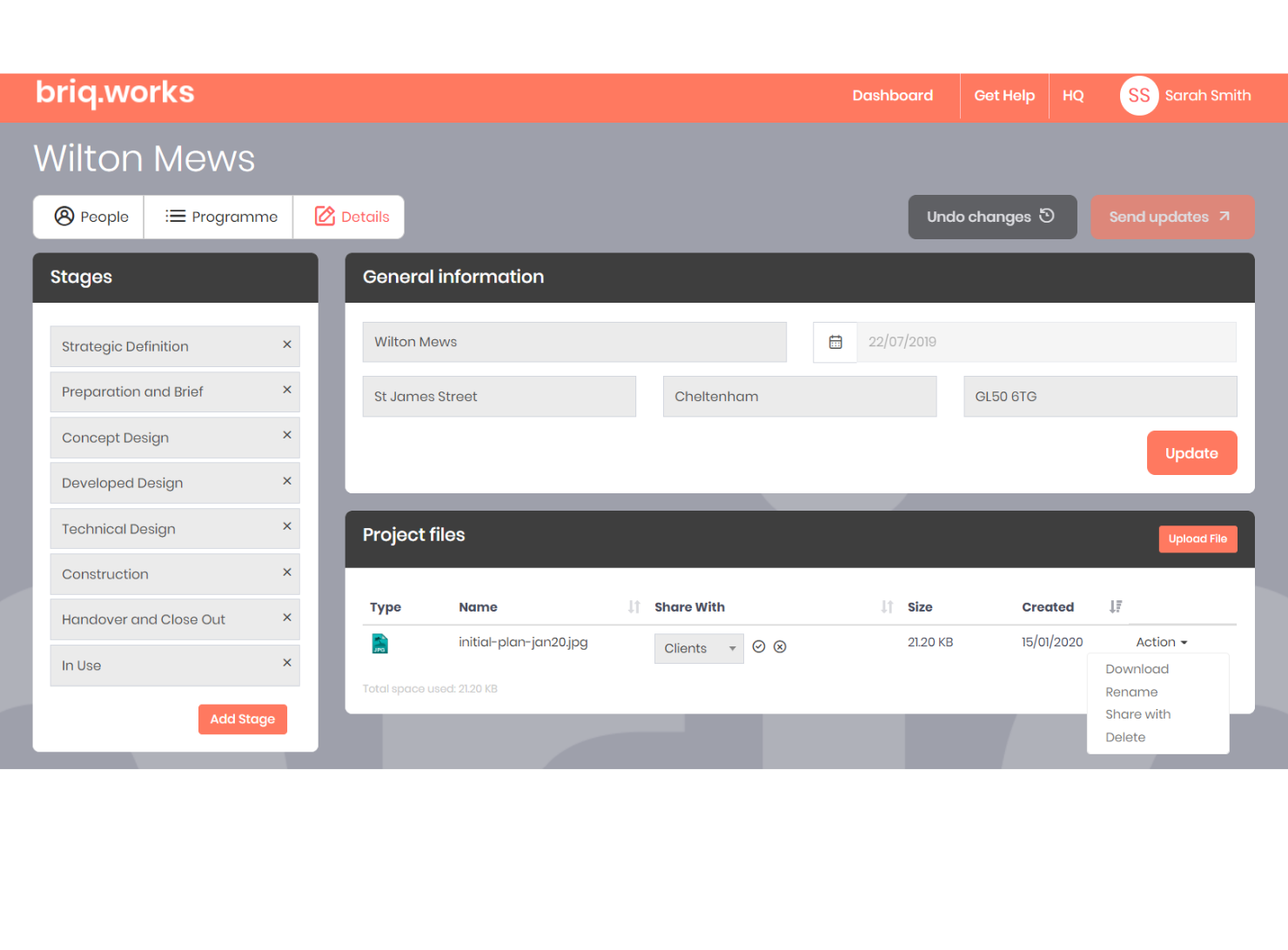 It’s also possible to make these documents available for your client and/or the whole project team to see via their online portal view of briq.works. This ensures all members of the team are seeing the same documents, know where to go to view the latest status of everything related to the project, and avoids the need to send documents as email attachments or via file transfer.